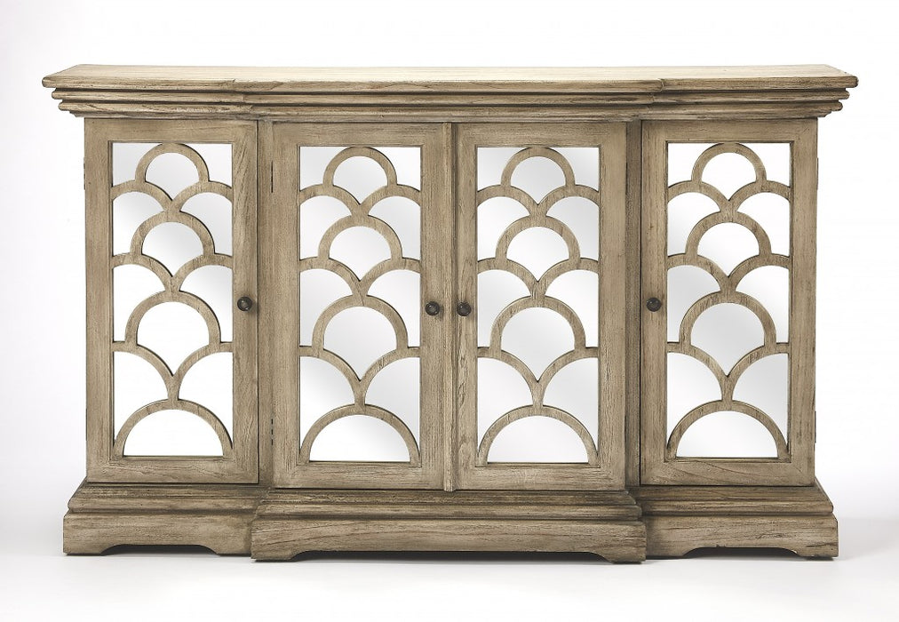 With four mirrored glass-paneled doors overlaid with intricate curved fretwork, this glamours sideboard brings class and storage to any dining, living room or entry. Featuring four doors an interior shelf, tailored molding, and a distressed neutral finish for a vintage look. Made with a mix of solid Mindi wood and manufactured wood, and mirrored glass on the cabinet doors.