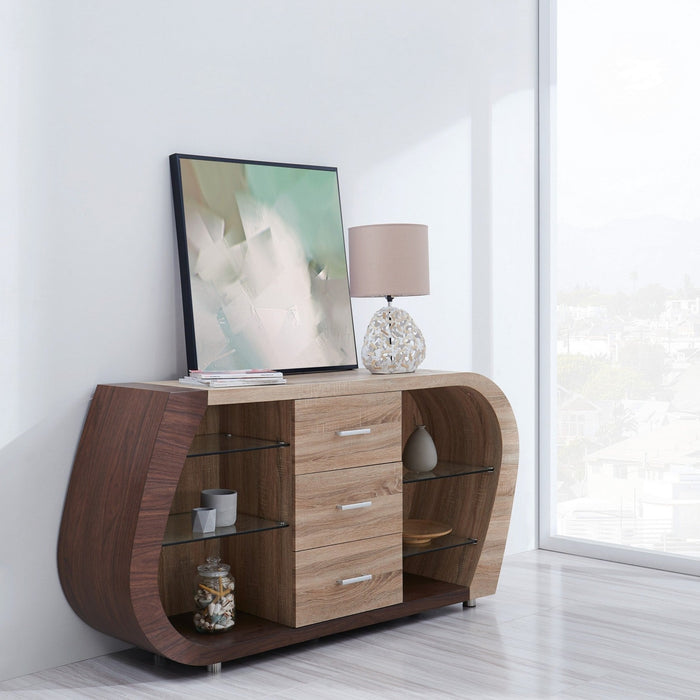 Space constraints in your dining area? Then this versatile storage buffet is the solution to all your home decorating needs. Storage problems disappear thanks to this buffet's abundant shelf space and drawers. Incorporating solid woods and veneers in a multi-toned oak and walnut-look finish, this buffet is an easy fit for many room decors and will add drama and sophistication to any room environment. Quality construction ensures durability and long lasting wear. This buffet is a smart choice for the discerning shopper and will give you the flexibility you need without sacrificing unique appeal.