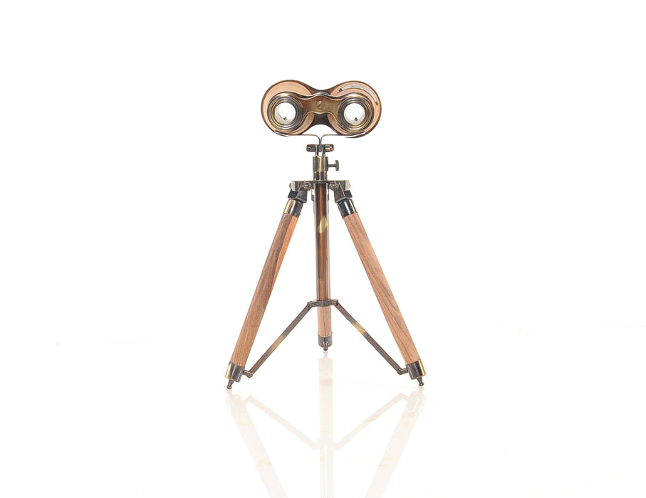 Based on a 19th century design, these Victorian binoculars were the next big invention in eyewear after the single lens telescope. The tripod stand allowed for a hands-free experience, allowing users to do more while using the binoculars. A pair of these on your desk immediately adds a level of sophistication and elegance. ? Made out of wood and brass with a two-toned bright annealed finish.