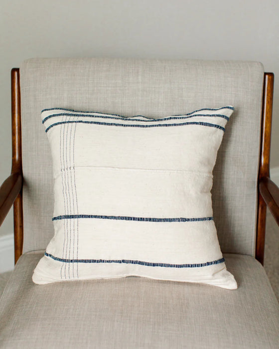 Hand-spun cotton with textured accents in navy blue give this pillow truly timeless style. Each has a rich texture and luxurious softness that comes only from handwoven natural fibers.