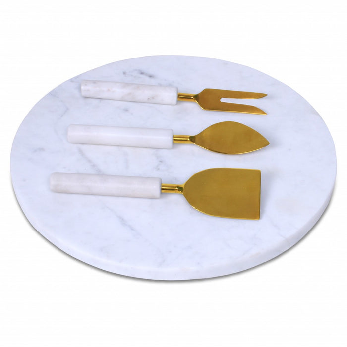 Impress any guest with this 12" Round White Marble Cheese Board and Knife Set. Hand-crafted from premium marble, this board is ready to host an appealing presentation of Charcuterie. The set comes with three quality marble and gold tone cheese knives that you can use for your wine and cheese platters. Pair the proper knife with your cheese with this fun and fancy set. This also makes the perfect holiday gift for your family and friends. It’s sophisticated white color, paired with the gold of the knives, gives off a classy vibe. 12" x 12" x 1".