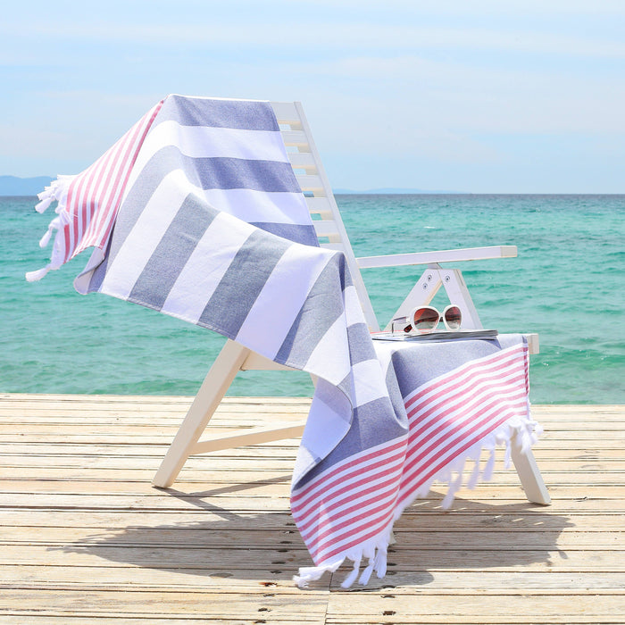Celebrate your summer at the beach, the marina, or the pool with our Patriotic Pestemal Beach Towel. This decorative, lightweight, 100% Turkish cotton beach-bath towel, features stripes with patriotic colors on its flat woven front and super soft terry on the back for maximum absorbency. This collection makes a great gift for Memorial Day, Independence Day, or any Patriotic events.