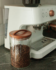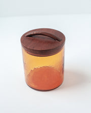 Handblown then meticulously hammered by hand, these recycled glass canisters feature a beautiful pebbled texture and deep, earthy colors. They are topped with a striking hand-carved lid made from FSC-certified mango wood. Each takes hours to make using skills passed down through generations.