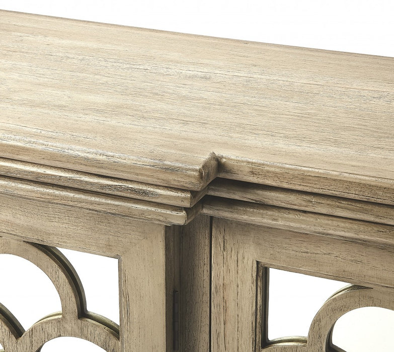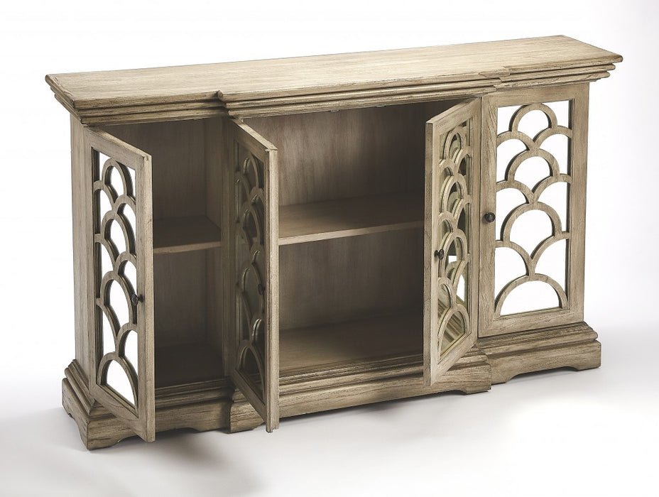 With four mirrored glass-paneled doors overlaid with intricate curved fretwork, this glamours sideboard brings class and storage to any dining, living room or entry. Featuring four doors an interior shelf, tailored molding, and a distressed neutral finish for a vintage look. Made with a mix of solid Mindi wood and manufactured wood, and mirrored glass on the cabinet doors.