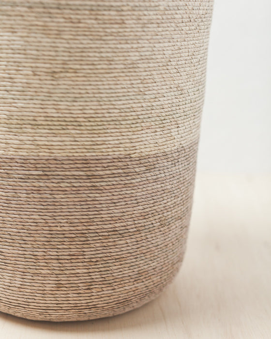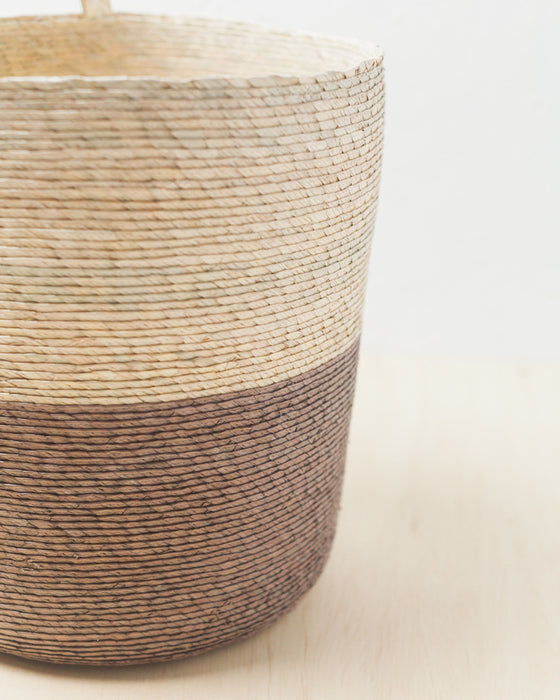 Masterfully woven in Mexico from braided palm leaves, each of these baskets takes days to complete. Artisans carefully select the best palm leaves then dry and weave them using methods passed down through generations. This classic yet functional design pairs natural palms with a block of subtle earthy color.