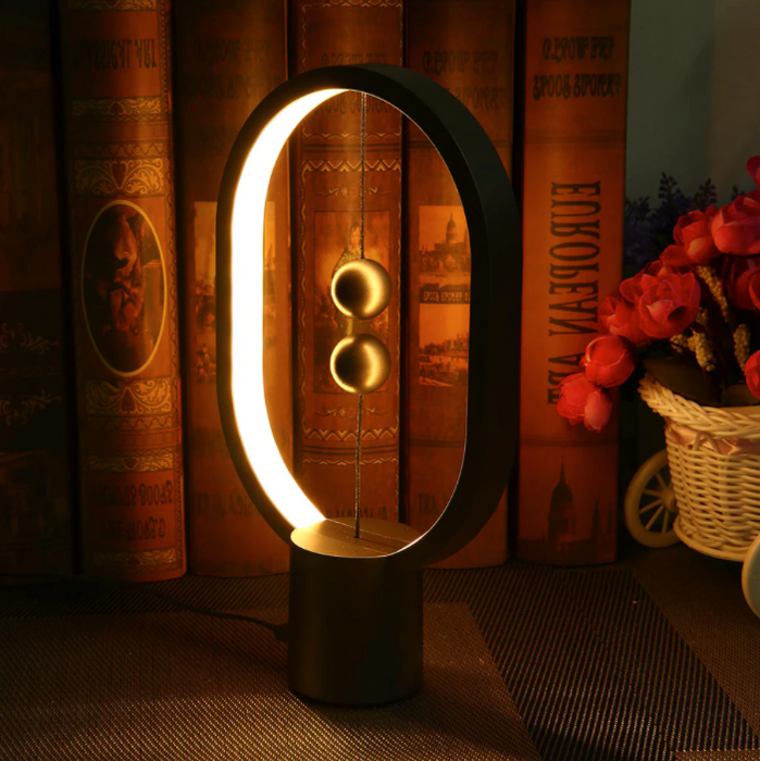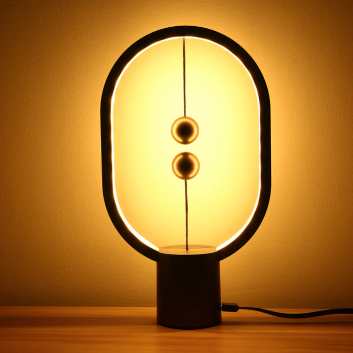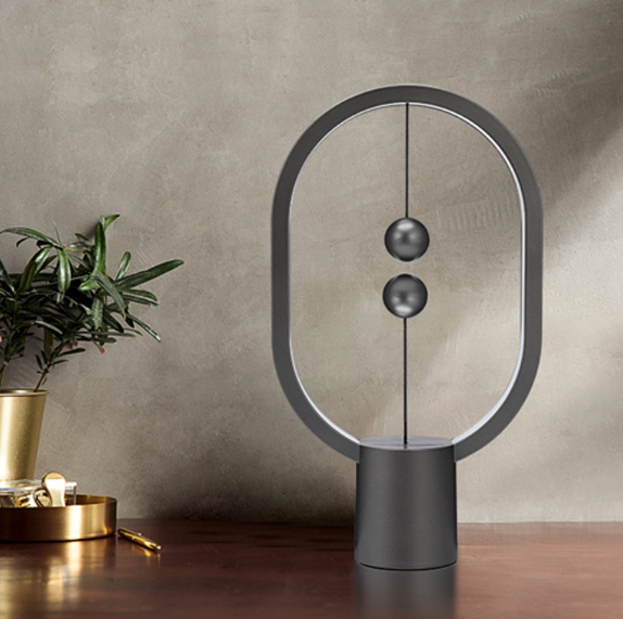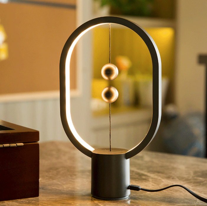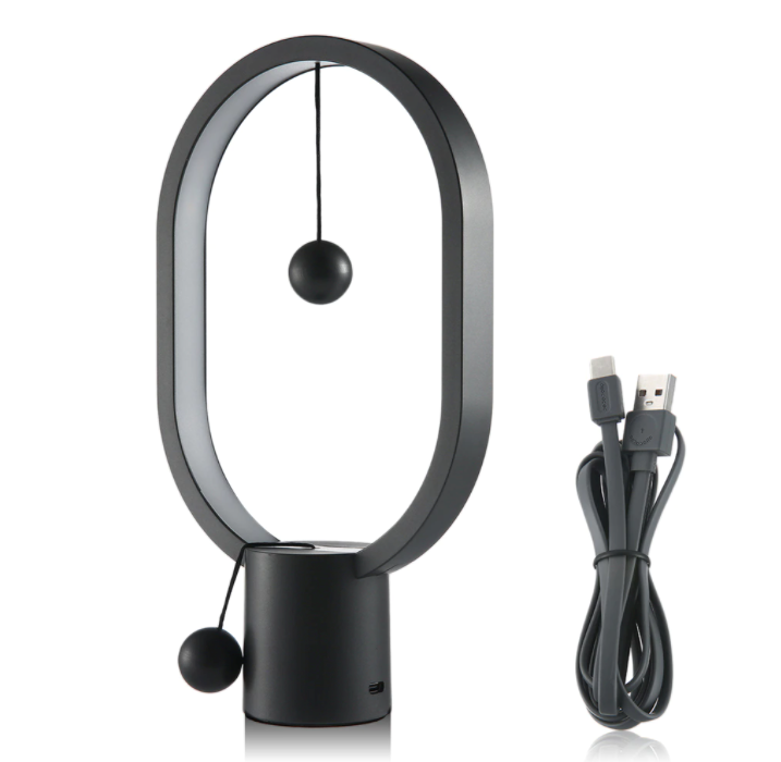 Heng Balance Lamp-a luxurious decoration of your office, living room, bedroom, and other rooms, which will surprise you and your friends and relatives with its minimalist design and unique on and off! This balance night light has a special oval appearance. It embeds LED lighting components in the frame of ABS material, leaving a way out for the light. The two balls act as a switch and the light charges by the USB-C port. Once fully charged, you can move the magnetic lamp at will without the cable plugged in. Please note that when the indicator light is flashing, the table lamp should be recharged.
