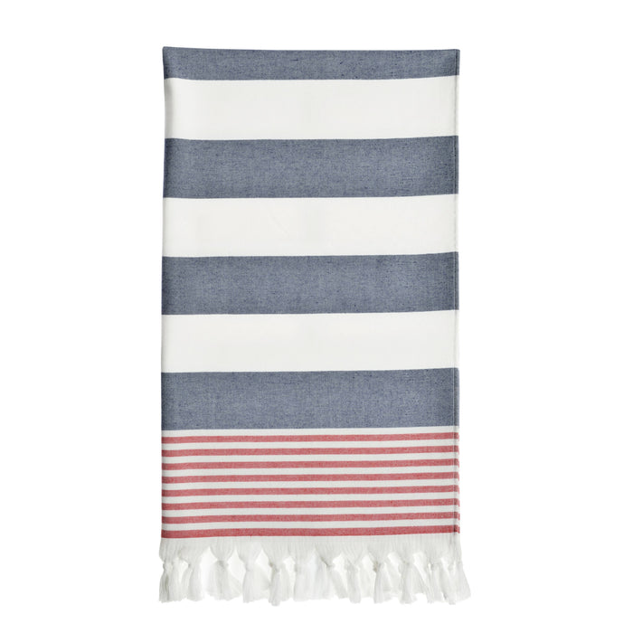 Celebrate your summer at the beach, the marina, or the pool with our Patriotic Pestemal Beach Towel. This decorative, lightweight, 100% Turkish cotton beach-bath towel, features stripes with patriotic colors on its flat woven front and super soft terry on the back for maximum absorbency. This collection makes a great gift for Memorial Day, Independence Day, or any Patriotic events.