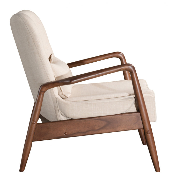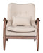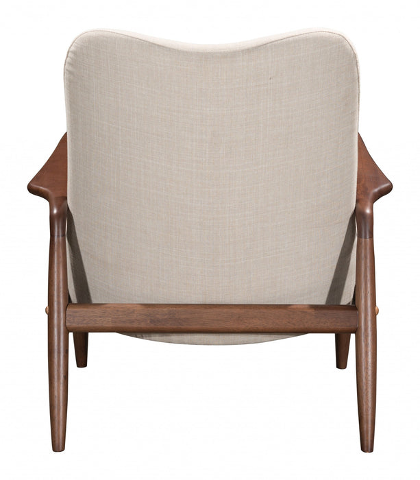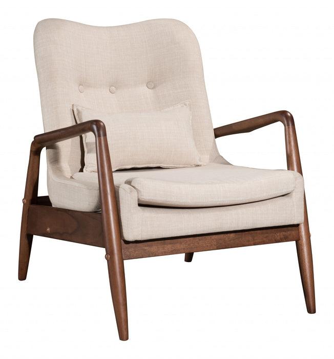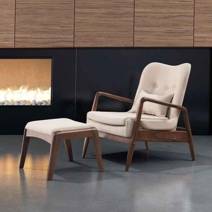 Add some unique style to your space with this Walnut and Beige Modern Retro Chair and Ottoman Set. This ensemble includes a cool looking armchair in a warm walnut wood finish that looks great with the beige linen look cushioned seat. The chair has slim rounded edge arms and the backrest has an arch for comfort. Premier button tufting is added for design interest, and the chair even includes an extra lumbar pillow for the ultimate in back support. The coordinating ottoman is also cushioned and is a great compliment to the chair, making this a go to spot for your daily rest. With a nod to mid-century modern design, this groovy wood and polyester lounge chair and matching ottoman set will be a great way to accent your space with practical design senses. 32.7" x 30.3" x 33.5".
