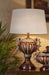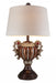 Treat yourself to a richly designed lighting piece with this Tall Bronze Urn Shaped Table Lamp. The intricately designed body is adorned with red jewels, complimenting the lamp in a regal and luxurious manner. The addition of bronze finishing with silver accents showcases a more refined and sophisticated style, lending you a furniture piece that is both functional and stylish. The high quality lampshade made of white fabric completes the look, giving it a soft and ambient touch. 29.5" x 18" x 18"