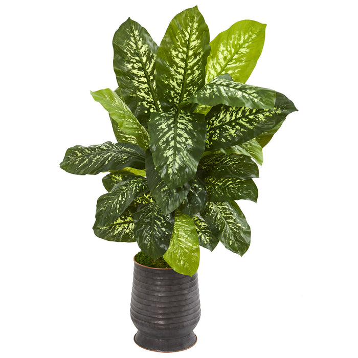 4’ DIEFFENBACHIA ARTIFICIAL PLANT IN RIBBED METAL PLANTER (REAL TOUCH)