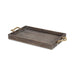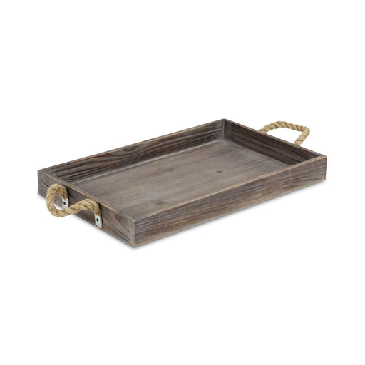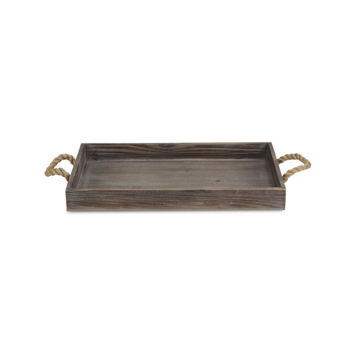 This Dark Brown Wooden Tray with Rope Handles will be the perfect way to add a touch of contemporary design to your home. The tray is made from solid wood which has a distressed see-through dark brown finish on it. There are two rope handles on either side which are attached to the tray by two silver hooks that are held in place by two small black screws. You can use this tray as a serving tray, or it can also be used a decorative tray serving as the centerpiece of your coffee table. 2" H x 19.75" W x 11.75" D.