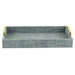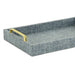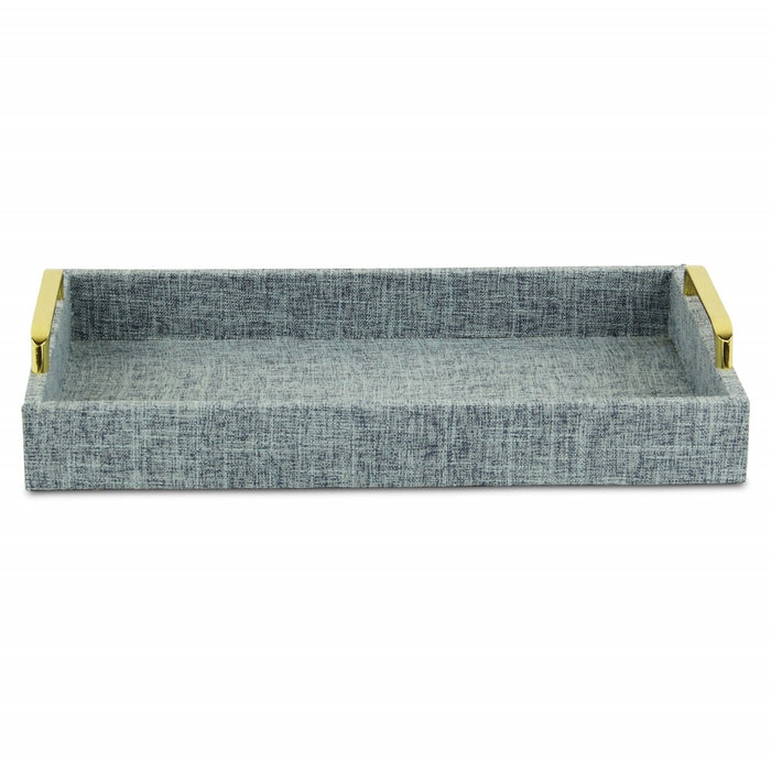Stylishly presentable with endless functionality, the Light Blue Linen and Wooden Tray has to be one of the most essential items in your kitchen or dining. Catering to all your serving, storing and decorative needs, the tray is fabricated from engineered wood and combined with a classy light blue fabric overlay collaborated with prominent gold raised handles. Spruce up your home with this heather styled creation and complete your themed look. 2.5" x 15.75" x 9.5".
