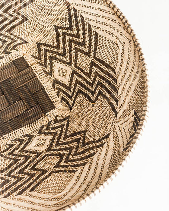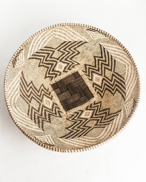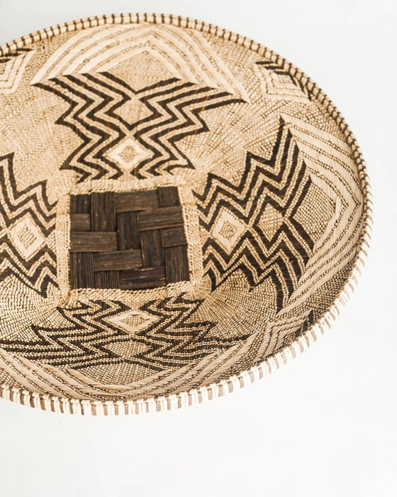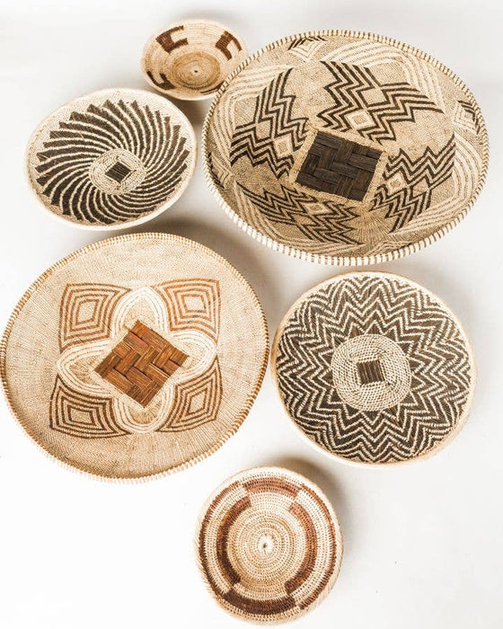 This statement basket measures a striking 28 inches. Use it as the centerpiece to your wall basket collection or as a grand tabletop accent. Hand-crafted in rural Zambia from dried palm leaves, no two of these distinctive baskets will ever be exactly the same.