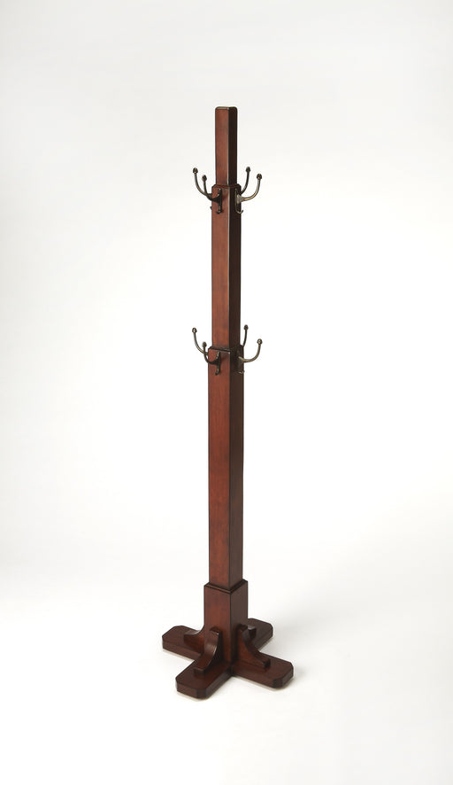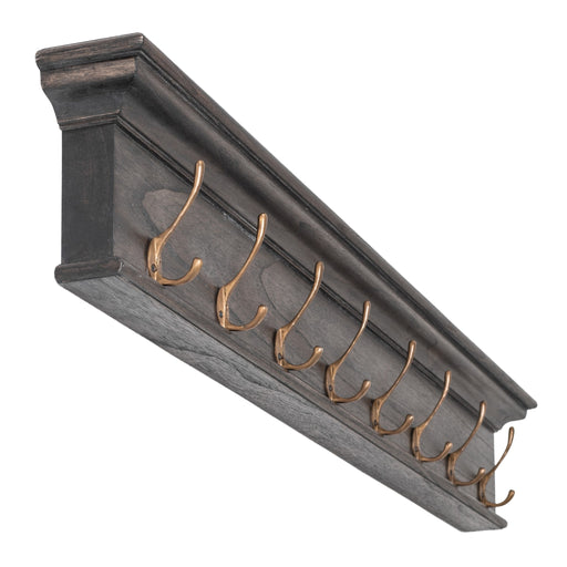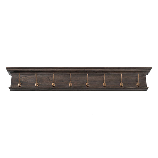 Enliven your home with this aptly designed Rustic Black Wash Wood Eight Hook Hanging Coat Rack. Handcrafted from mahogany wood, with eight large antiqued brass hooks, the rack has a slightly distressed warm black stained finish. Creatively fashioned to include a small shelf, the top of the rack has just the right amount of space to display decorative artifacts or even small plants. Crown moldings adorn the top of the shelf to complete the traditional look of this rack. The large multipurpose hooks are built to support anything from keys and coats to handbags as well. A hook rack with the ability to add finesse and elegance to any home. 7.87" x 51.18" x 3.94".