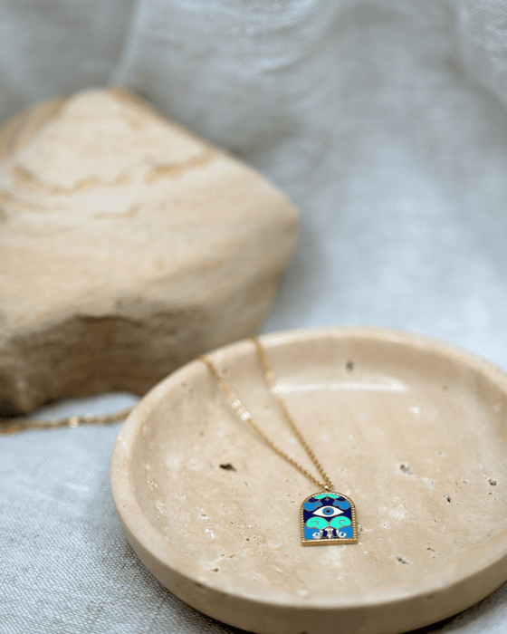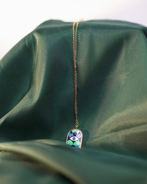 Abrace la mística y el encanto protector de nuestro cautivador collar con colgante Evil Eyes, una fusión de la antigua herencia romana y la elegancia moderna. Diseñado con acero inoxidable resistente y adornado con un opulento baño de oro de 18 quilates, este collar con ojos de esmalte azul personifica la durabilidad y el lujo. El intrincado colgante en forma de arco azul muestra el icónico motivo Evil Eye, venerado por su capacidad para repeler la negatividad y atraer bendiciones. Combinando una tradición atemporal con un estilo contemporáneo, este collar sirve no solo como un accesorio elegante sino también como un talismán de protección y positividad. Eleve su conjunto y aproveche el antiguo misticismo plasmado en nuestro collar con colgante Evil Eyes.