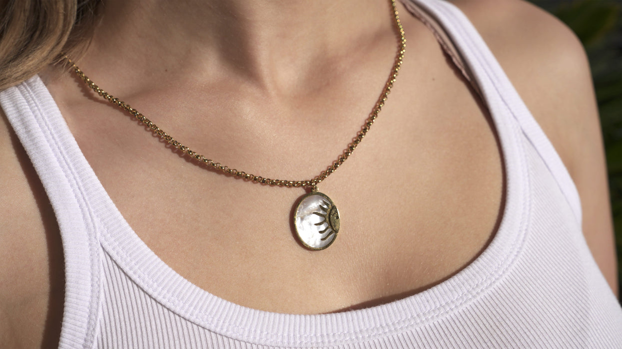Nuestro collar con colgante de concha de perlas Sunburst personifica la artesanía exquisita, meticulosamente adornado con un baño de oro de 18 quilates y elaborado con acero inoxidable resistente. Esta impresionante pieza de joyería presenta un cautivador colgante en forma de sol, delicadamente elaborado con auténtica concha de perla, que irradia gracia y refinamiento. Los intrincados detalles realzan su elegancia, convirtiéndolo en una adición versátil a cualquier conjunto para diversas ocasiones. Con su fusión de elementos premium y encanto atemporal, nuestro collar con colgante de concha de perla Sunburst se erige como un símbolo de individualidad y realza su estilo con su encanto distintivo. Abrace la radiante belleza del sol y el encanto del océano con este encantador collar, que personifica tanto la opulencia como el esplendor natural.