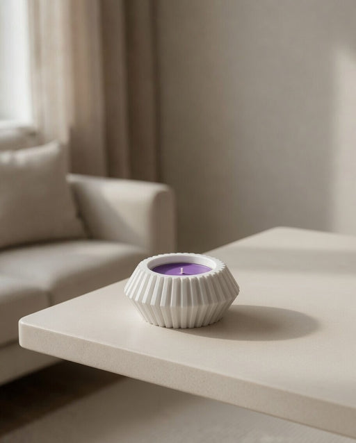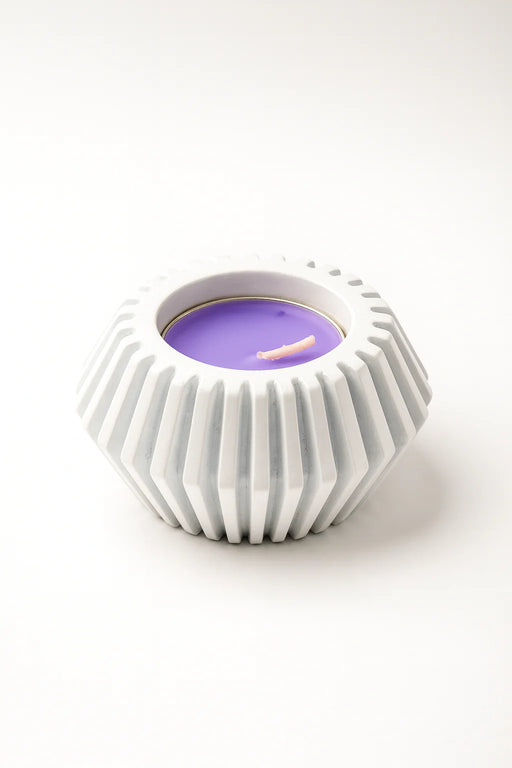 A compact tealight holder defined by its angular ribbed geometry and low, grounded profile. The faceted outer structure creates a subtle halo effec...