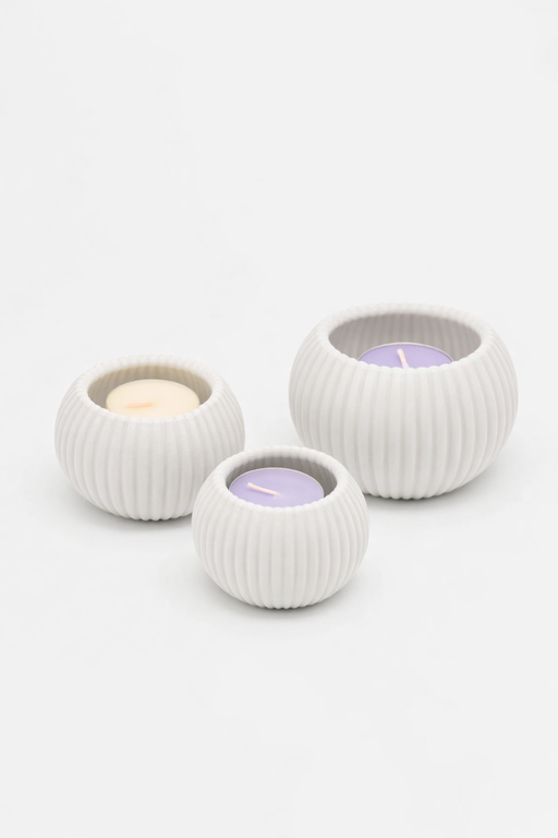 A compact, modern tealight holder defined by its vertical ribbed texture and clean cylindrical form. The structured lines create a soft play of lig...