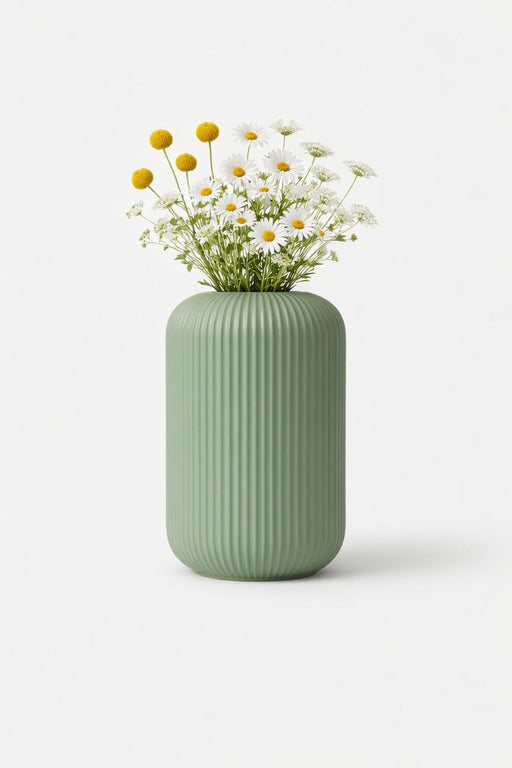 A clean, minimalist vase defined by its smooth cylindrical shape and fine vertical ribbed texture. The design focuses on simplicity and proportion,...