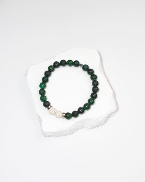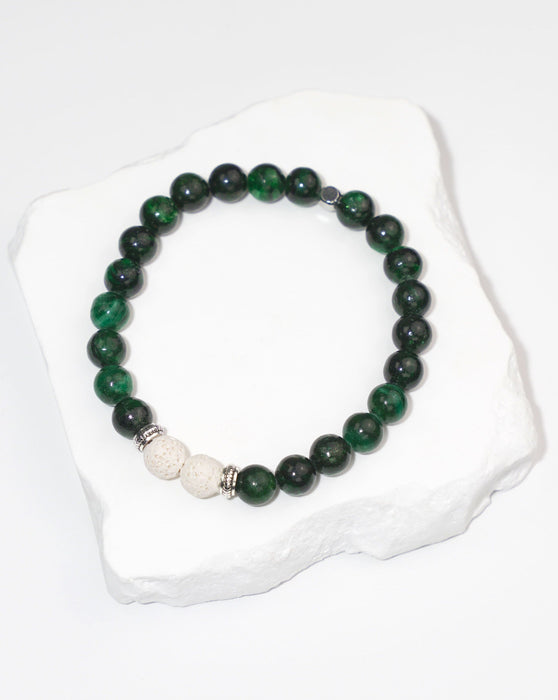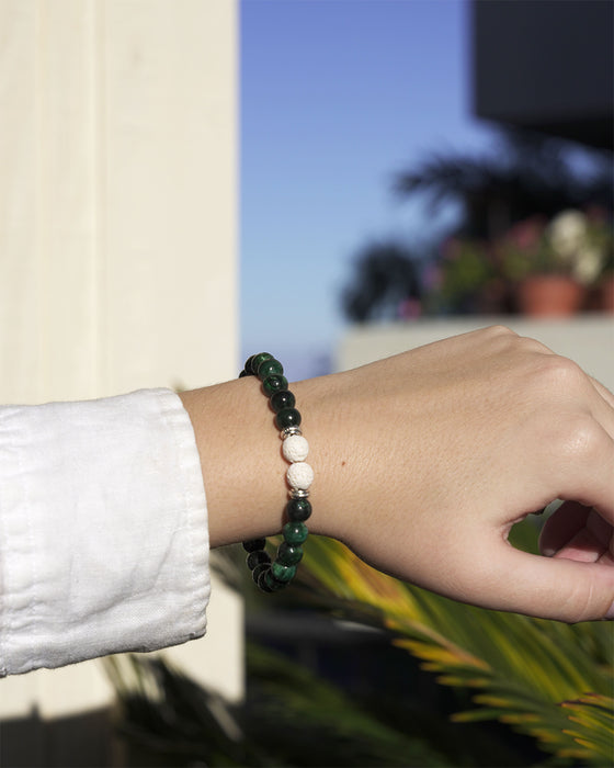 Elaborada a mano con piedras preciosas auténticas, con cuentas de lava blanca y esmeralda, esta pulsera emana energía cristalina propicia para la curación y la revitalización del equilibrio energético. Abrace esta exquisita pieza para desbloquear su nobleza interior y alcanzar la armonía espiritual.