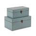 Este juego de dos cajas de almacenamiento de madera azules es la manera perfecta de agregar un diseño contemporáneo y utilidad a cualquier espacio de su hogar. Este juego contiene dos cajas de diferentes tamaños. Las cajas tienen un acabado en azul pálido envejecido. Hay ganchos de cierre de metal en cada caja en un color bronce apagado. Estas cajas son perfectas para almacenamiento, decoración o como combinación de ambos. Puedes utilizar ambos en el mismo lugar, o dividirlos y utilizarlos en diferentes estancias de tu hogar. 5" alto x 10" ancho x 6" profundidad.