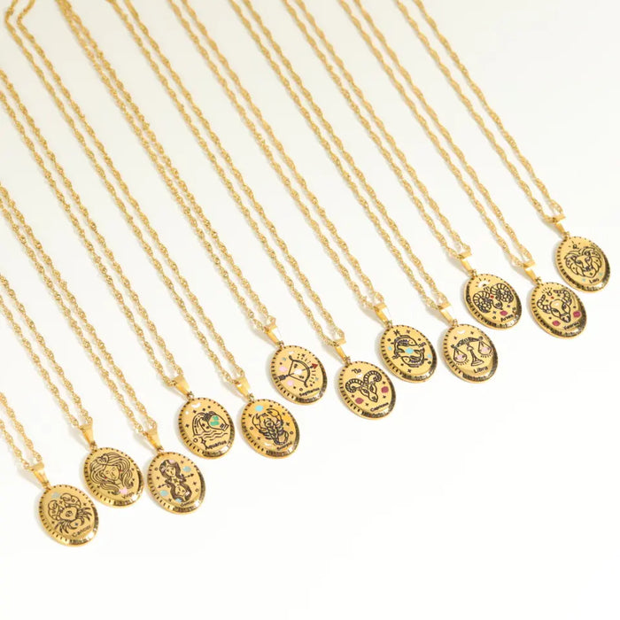 El collar con colgante Vintage Zodiac combina a la perfección la elegancia atemporal con un toque de estilo contemporáneo. Meticulosamente elaborado, este collar cuenta con un colgante del zodíaco elaborado en acero inoxidable de alta calidad y lujosamente chapado en oro de 18 quilates, lo que garantiza durabilidad y una estética sofisticada.