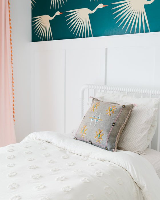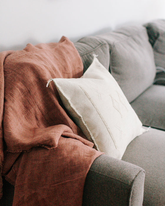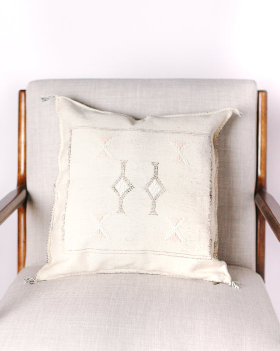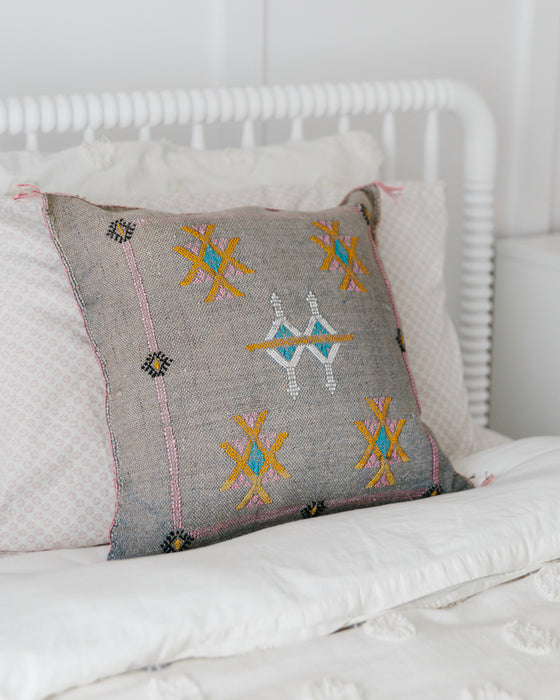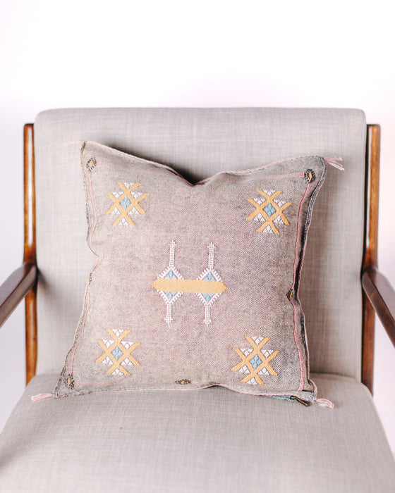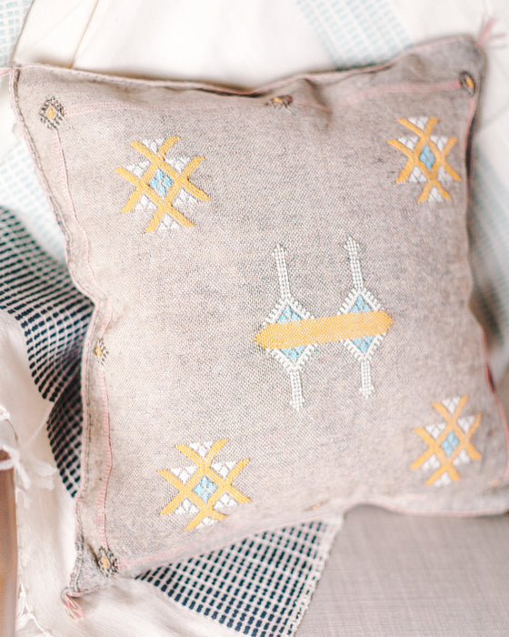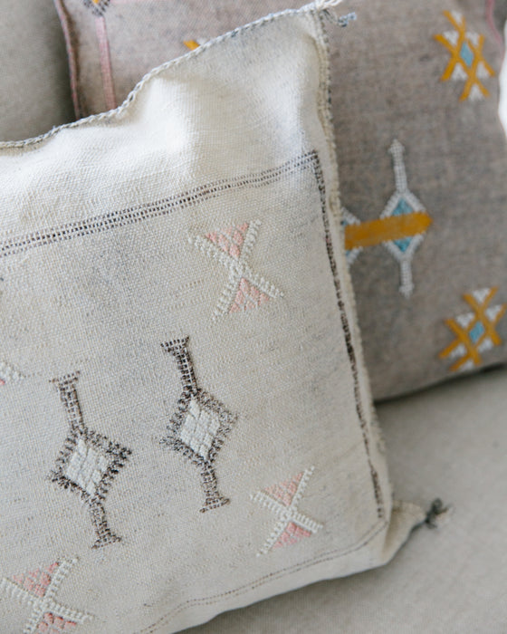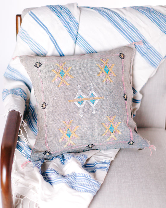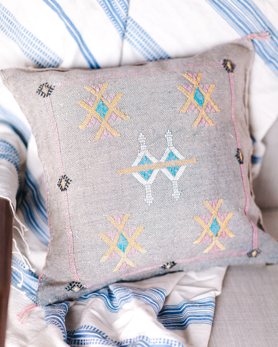 Ethically crafted from natural fibers and dyes, each of these cactus silk pillows represents days of work and generations of skill passed from mother to daughter. Just outside of Marrakech, a remarkable group of women transform the natural fibers of desert agave into beautiful silken thread using time-honored methods. The hand-spun thread is then masterfully woven on family looms and embroidered with traditional motifs. Through their weaving, these women are redefining traditional gender roles and finding financial independence.