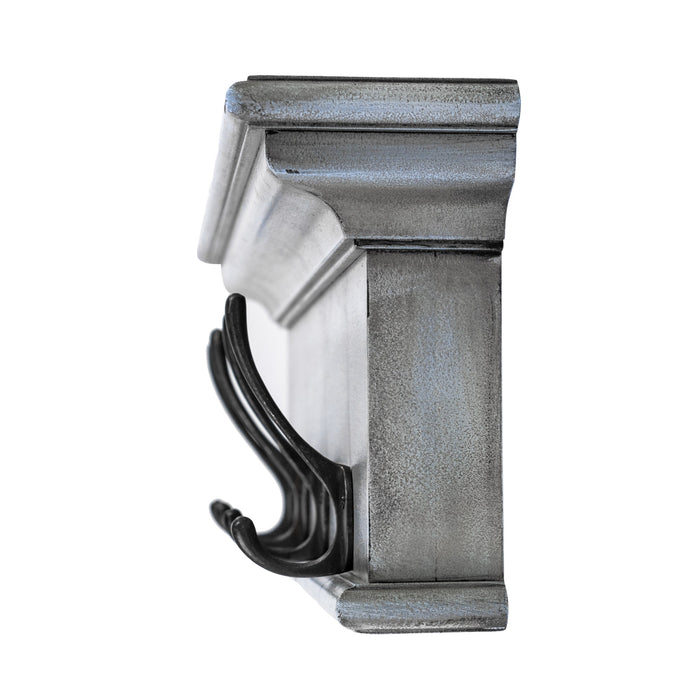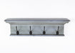 Enliven your home with this aptly designed Rustic Antiqued Black and Blue Four Hook Hanging Coat Rack. Handcrafted from mahogany wood, with four large antiqued brass hooks, the rack has a rustic and distressed creamy ivory with brown distressing finish. Creatively fashioned to include a small shelf, the top of the rack has just the right amount of space to display decorative artifacts or even small plants. Crown moldings adorn the top of the shelf to complete the traditional look of this rack. The large multipurpose hooks are built to support anything from keys and coats to handbags as well. A hook rack with the ability to add finesse and elegance to any home.