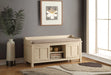 This storage bench offers functional storage and seating capabilities that you'll grow to love. This cream rectangular bench with seat cushion has 2 front sliding doors, featuring shelves inside, and the middle shelf area is perfect for hiding your shoes as you walk in. Place this bench in your hallway, laundry room or living room for a functional, stylish storage solution. Some Assembly Required.