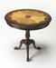 Portraying a combination of mid-century and chic, the Traditional Cherry Round Pedestal Table is simplicity defined. Handcrafted from manufactured wood solids, the table-top boasts of a beautiful maple and walnut veneer inlay design. The entire table is supported on an urn shaped pedestal which concludes in three exquisitely crafted splayed out legs. The glistening dark brown color completes the Traditional cherry look. It's the perfect addition to your den or living room.