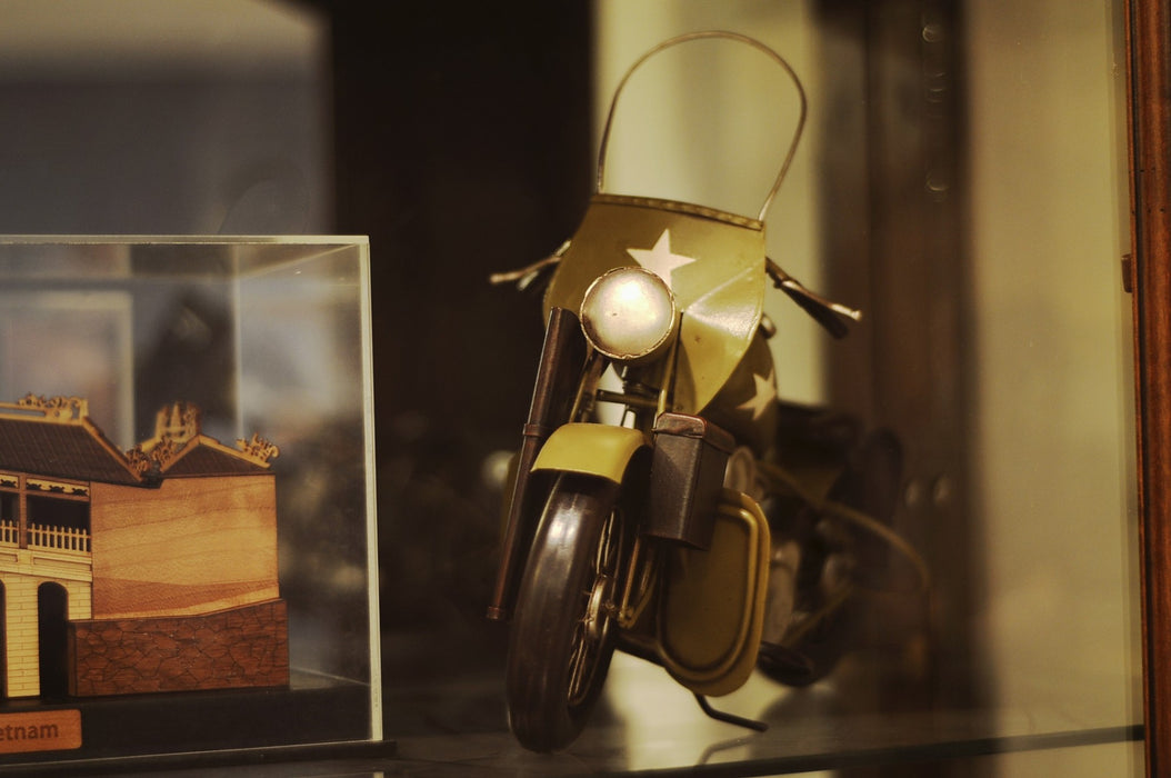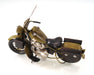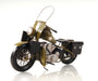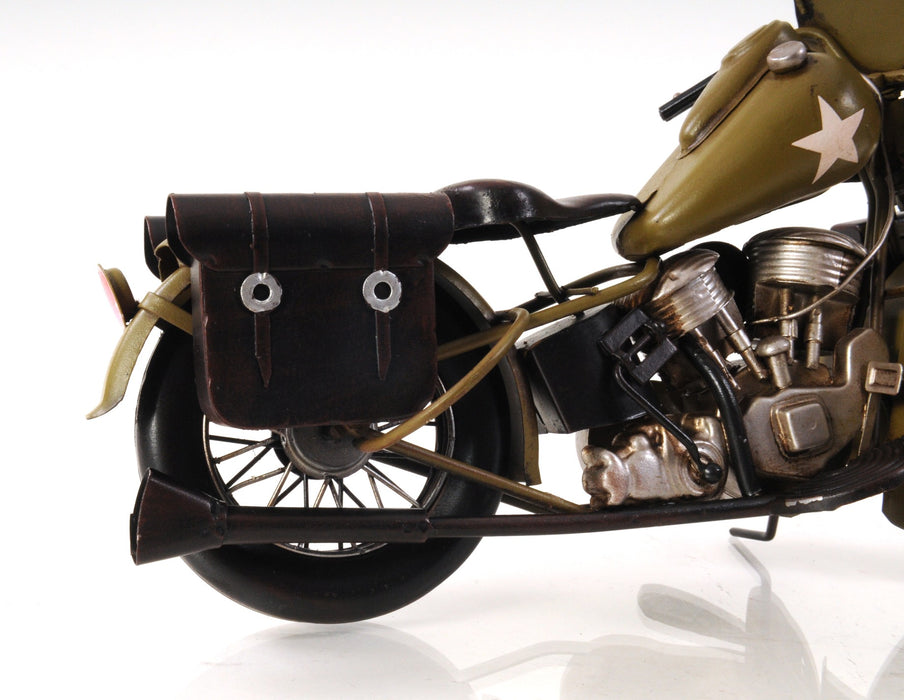 Authentic and realistic, the c1942 Green U.S. Army Motorcycle Sculpture is a replica of the iconic bike built for military use in WWII. It features a V-twin engine design with a headlight and windshield. Handcrafted out of metal, it features all the original details of the bike. The spoke rolling wheels, pedals, and exterior details such as ammo and gun pouches only emphasize the bike's character. A great gift for bike lovers and enthusiasts.