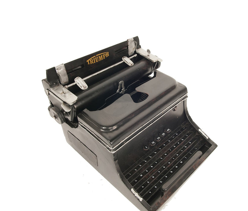 Hand-crafted out of metal and beautifully detailed, the 1945 Triumph German Typewriter Sculpture is an accurate replica of the most famous German typewriter introduced after WWII. With incredible details like type bars, shift key, lever, and paper feeding roller, this unique model is a great conversation starter and a great display piece.