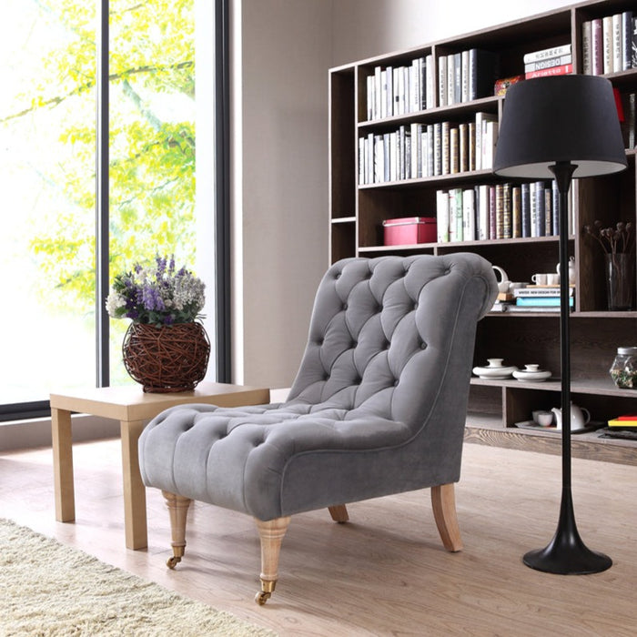 Add both allure and comfort to your home with this accent chair. Its elegant style and excellent craftsmanship will definitely break apart any inkling of monotony, and the obvious attention to details will turn the heads of your guests. This accent chair is an excellently crafted piece, which has a grey velour and foam upholstery and wood legs. This accent chair is certain to blend in with any interior design. As for measurements, they're 36 for height, 24 for width, and 37 for depth, and it weighs 41.4 pounds. This accent chair will give the ambiance of your home a breath of fresh air.