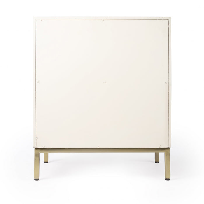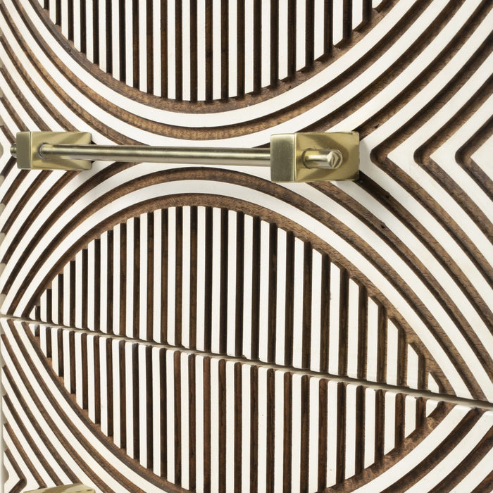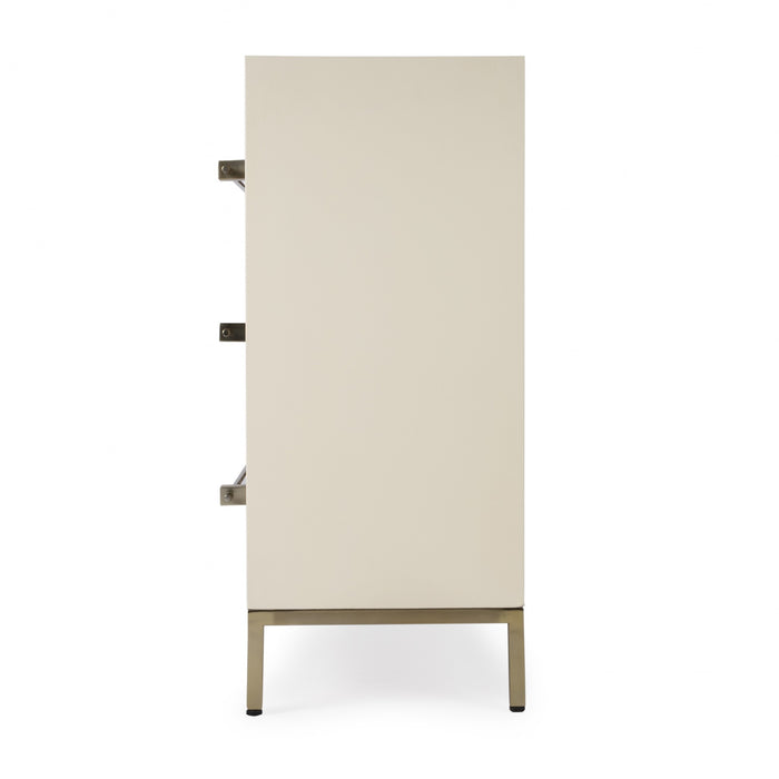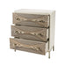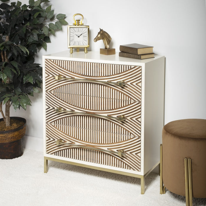 Perfect for extra storage space, use in your living room or family room. This chest is crafted from Mango wood, it showcases a clean-lined design, while a carved modern lines design adorns each drawer front. Three drawers offer plenty of space for storage, while its elegant gold tone handles and legs create an eye-catching accent. Drawer Dimensions: 26.5”W, 10.75"D, 6"H.