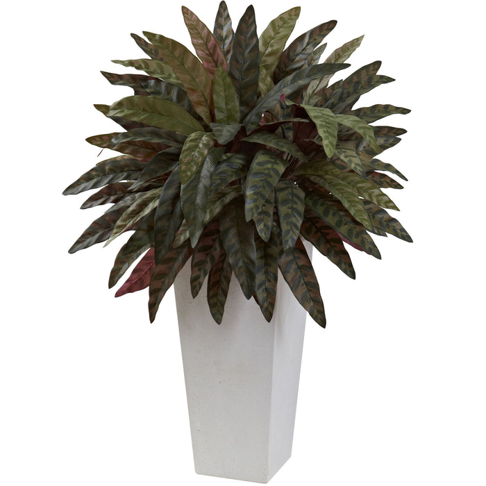 Like a proud peacock spreading its tail feathers, this beautiful re-creation explodes in both color and warmth. With its multi-hued leaves billowing out in every direction, it will be certain to command attention wherever you decide to place it. The included decorative white planter adds to the splendor, but the cherry on top is the fact that it never needs care or water, meaning it'll adorn your home or office for years to come.