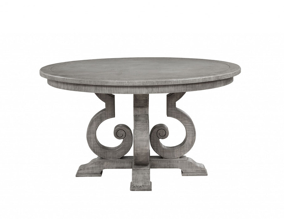 This dining collection features an impressive design for your dining area. This pedestal table is carefully chiseled from sturdy pieces of wood and overlaid with veneer. It is round and features a wooden base decked with scrolled motifs in a salvaged natural finish. Now you can serve meals and drinks in a stylish way at home. This deluxe dining collection is not only built to last, but smoothly blends with classic and modern decor designs. It is available in the size of 54 by 54 by 30 inches.