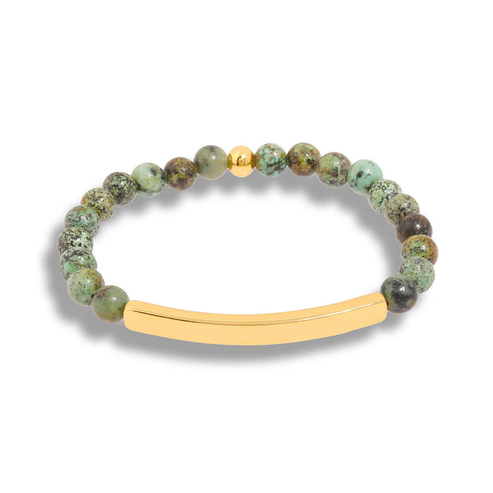 Embrace individual expression with this unique African Turquoise custom bracelet—an outstanding manifestation of statement jewelry. Enhanced by a gold rope, the design exudes elegance and refinement. Crafted from durable stainless steel, the bracelet guarantees both durability and longevity. The distinctive feature of this bracelet lies in the inclusion of African Turquoise, a semi-precious stone associated with transformation and protection. It is believed to attract success, balance energies, and contribute to overall harmony and well-being in life. For women seeking to express their uniqueness and infuse sophistication into their style, this bracelet serves as a beautiful accessory.