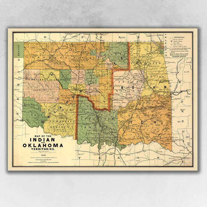 A custom reproduction of a true classic, this Map of Indian and Oklahoma Territories c1892 Vintage Travel Poster will add a touch of vintage design to any space in your home. This poster is printed on a heavyweight matte art paper and has a generous size. The map showcases the territories that are in the state of Oklahoma and the territories of Indian ancestral land. Most of the map is color coded, while some areas are left plain. Use this poster as it is, or frame or mount it to suit your aesthetic style.